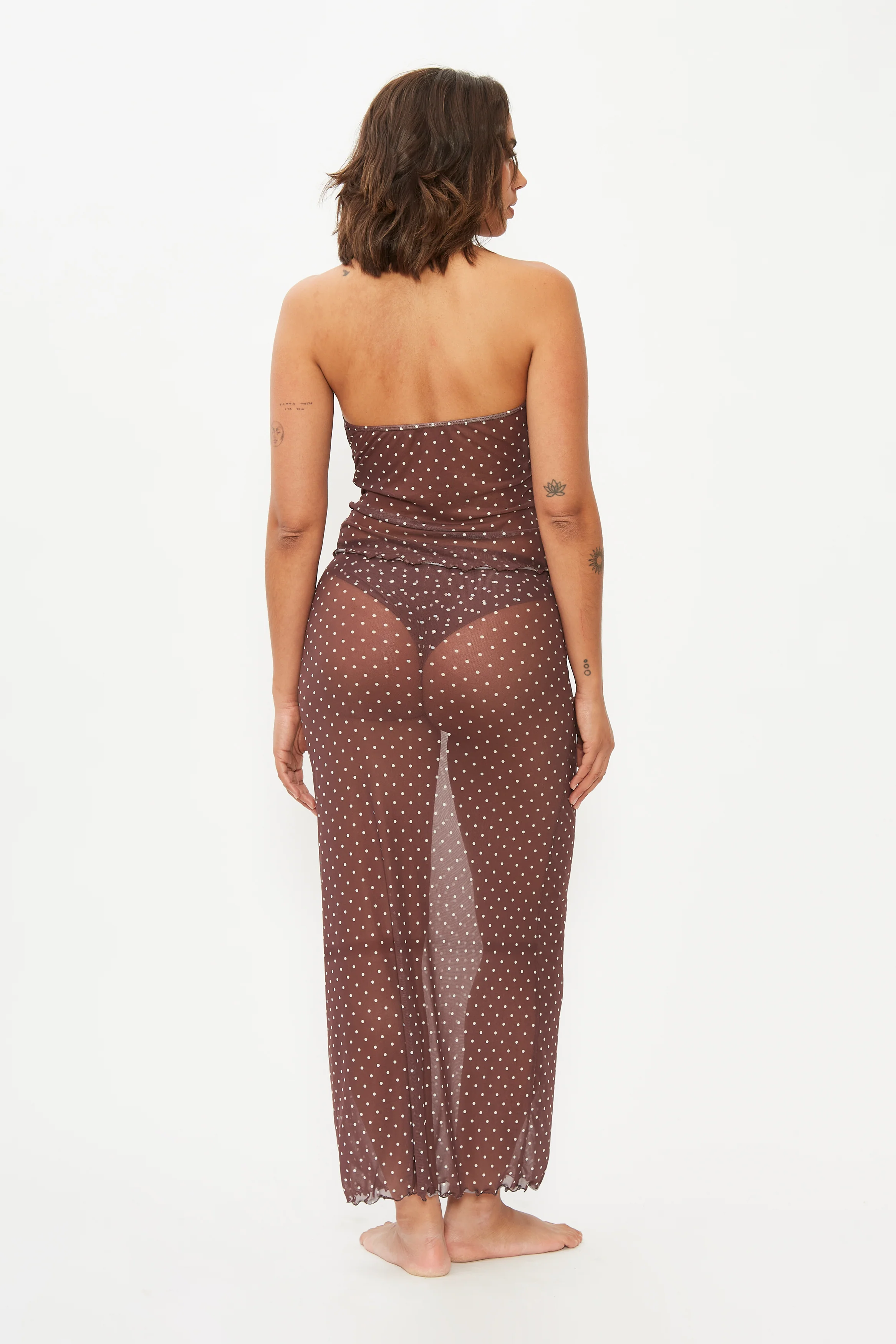 Sheer tulle polka dot maxi skirt. In brown with white dots. With an elastic waistband for a comfortable and flattering fit. Long, body-hugging cut perfect to pair with a matching bikini underneath.